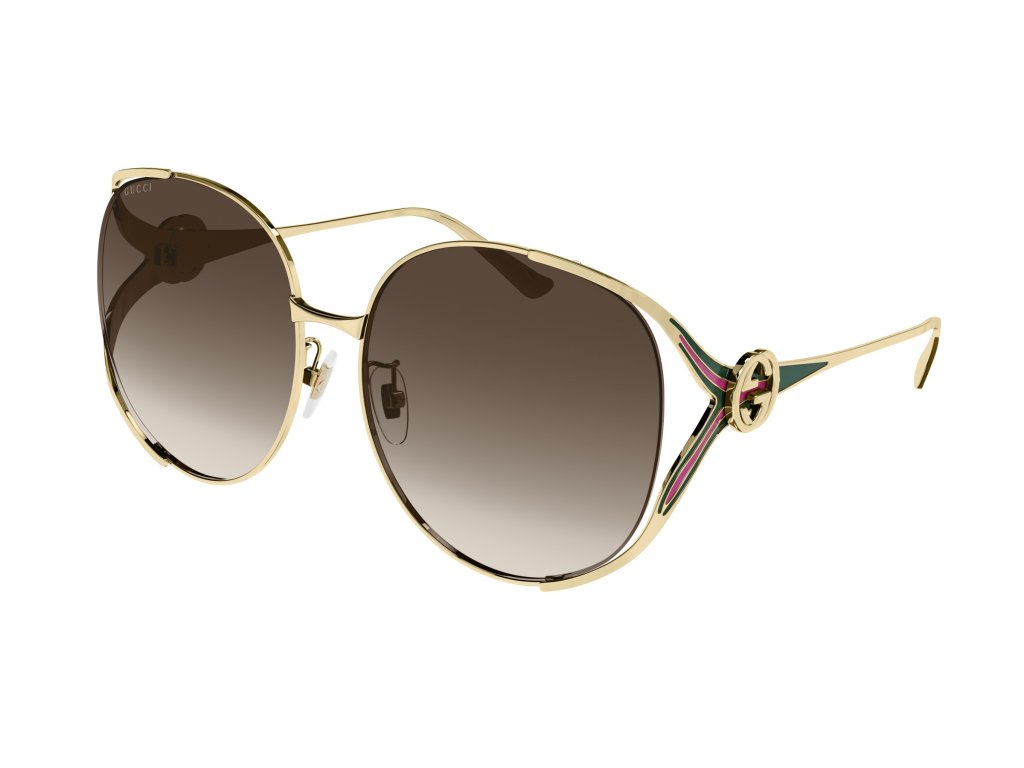 Popis: Full metal oversize round shape. Acetate front paired with metal temples with the iconic fork hinge and the GG interlocking logo on both temples. The SKUs are enriched with enamel details recalling the institutional Gucci web.