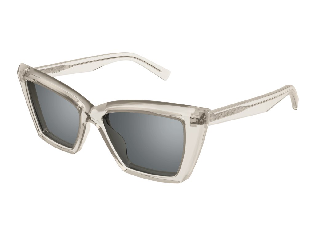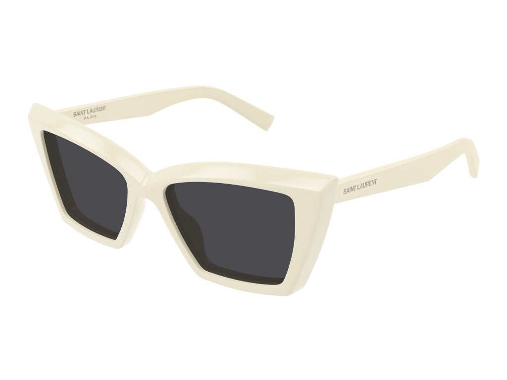 Popis: A simple, acetate construction is elevated by the sharp play of faceting on the front. Iconic curved design on the top line creating an oversized Cat Eye Shape. Saint Laurent laser engraved lettering logo on the temple.